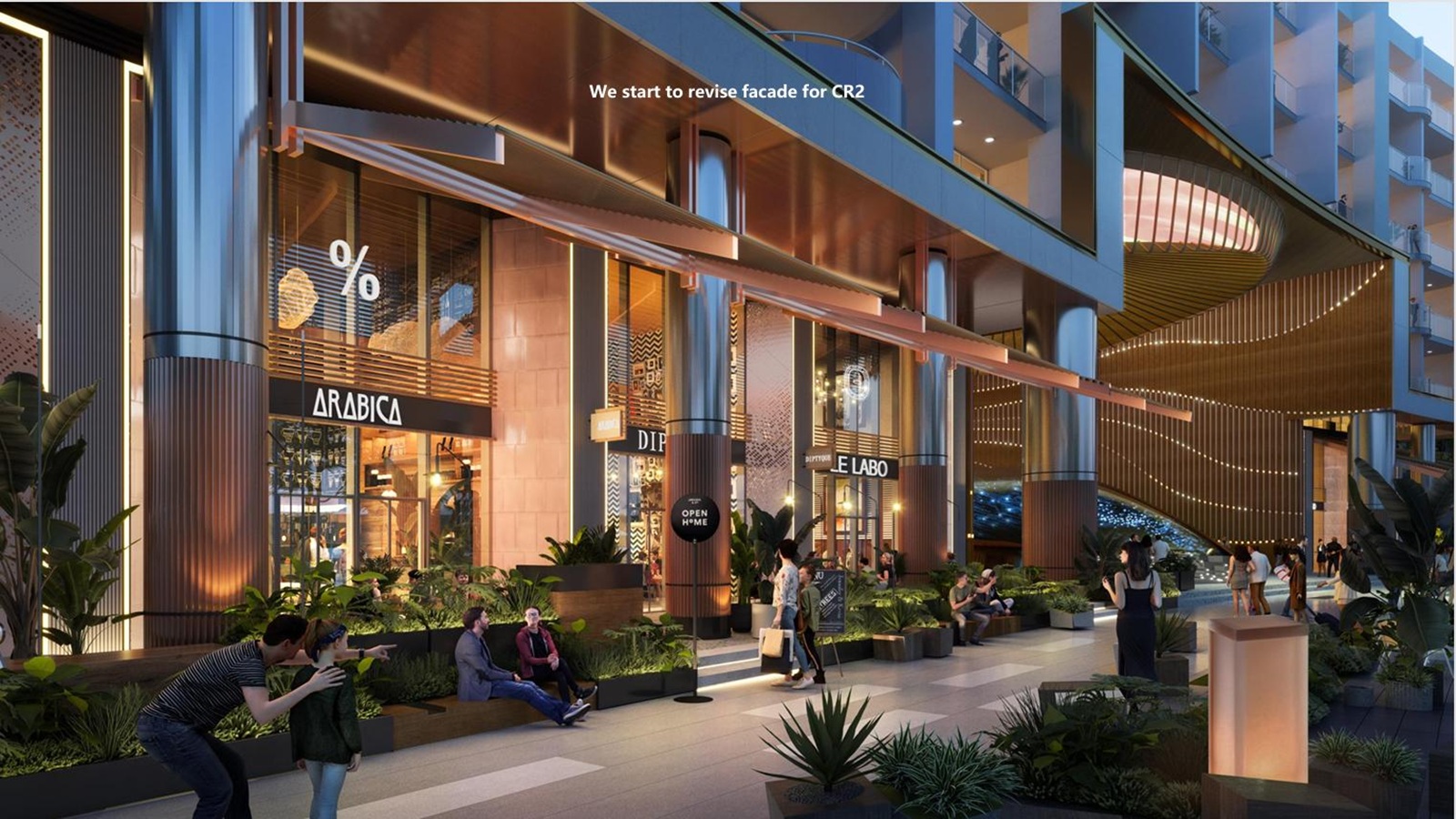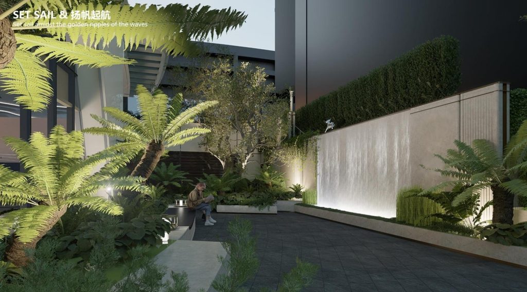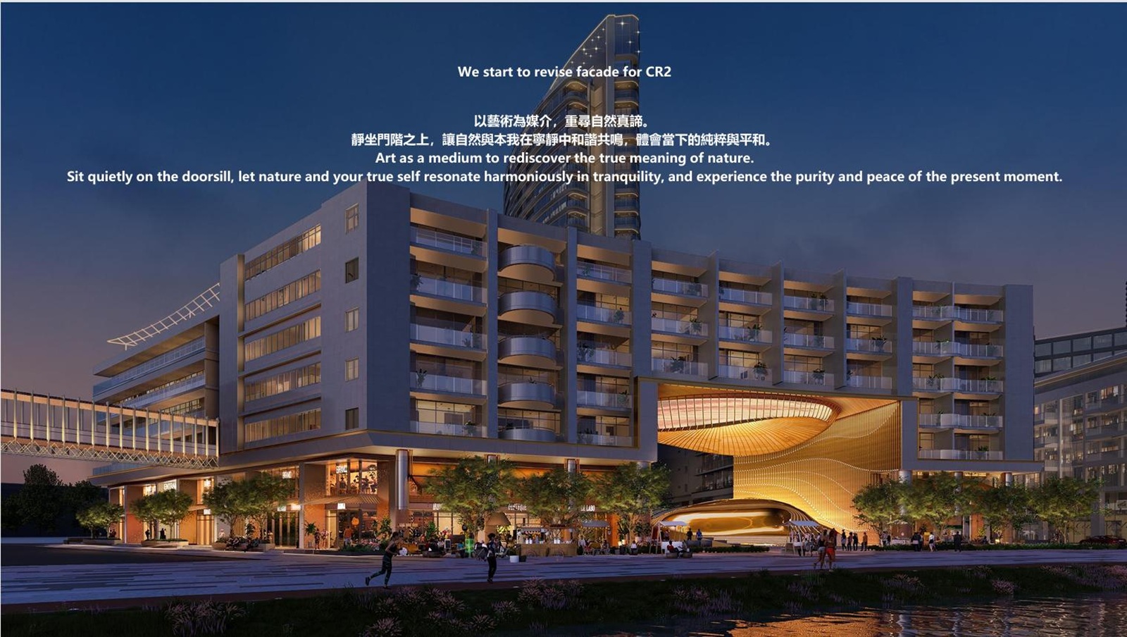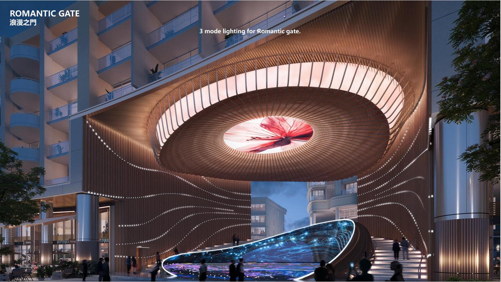 Khu Hồ Bán Nguyệt được thiết kế mô phỏng theo vịnh Singapore để tạo nên điểm nhấn, là một trung tâm của cộng đồng (a social heart) cho toàn đô thị với những tòa nhà hiện đại được xây dựng xoay quanh đường cong hình cánh cung của Hồ Bán Nguyệt, mục tiêu mang đến một trung tâm giải trí thú vị và khu mua sắm hiện đại cho tất cả mọi người.